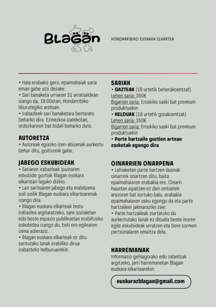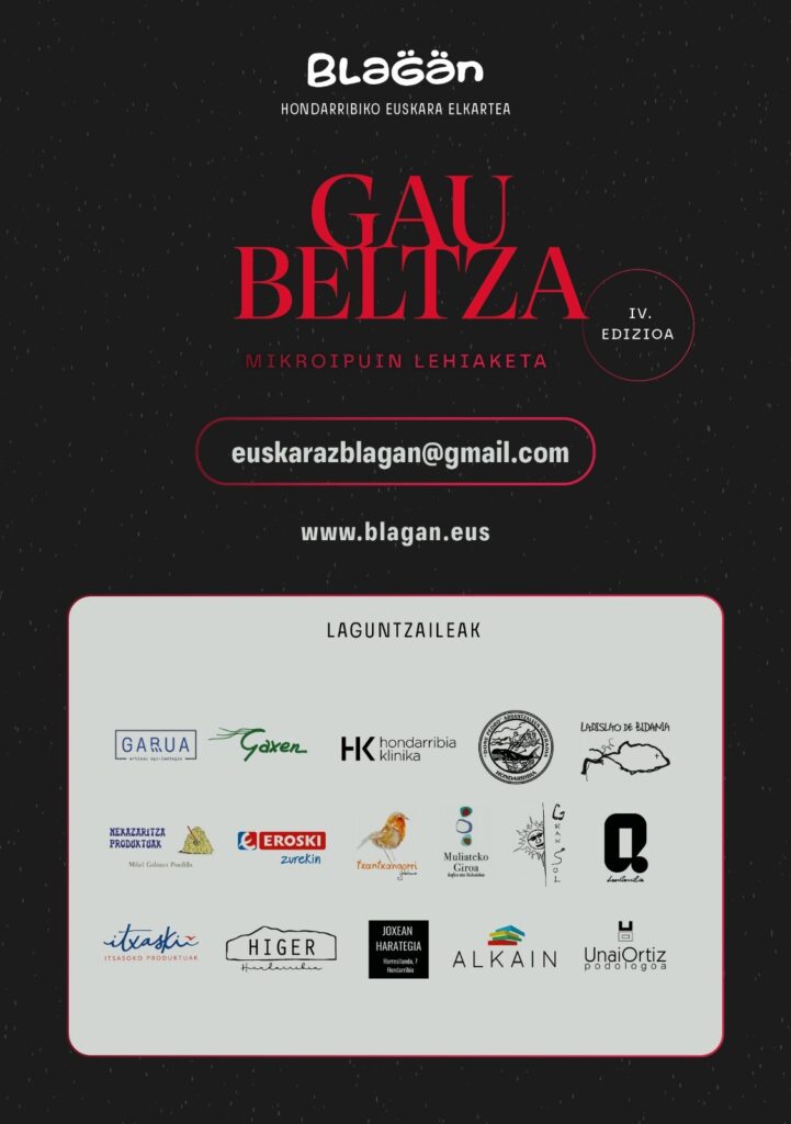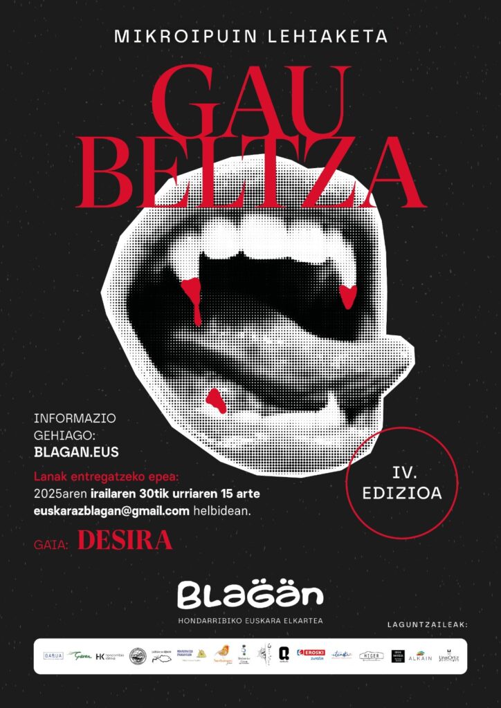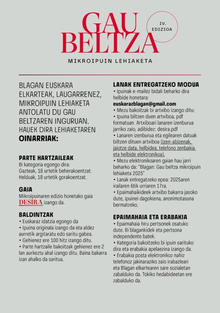 Aurten ere Blagan euskara elkarteak, mikroipuin lehiaketa antolatu du Gau Beltzaren inguruan. Gaia “DESIRA” izango da, eta mikroipuinak gai honen inguruan idatzi behar dira. Bi kategoria daude, gazteen eta helduen kategoria. Lanak entregatzeko epea: 2025aren irailaren 30tik urriaren 15 arte euskarazblagan@gmail.com helbidean. Baldintzak eta sariak behean dituzue. Animatu eta parte hartu!