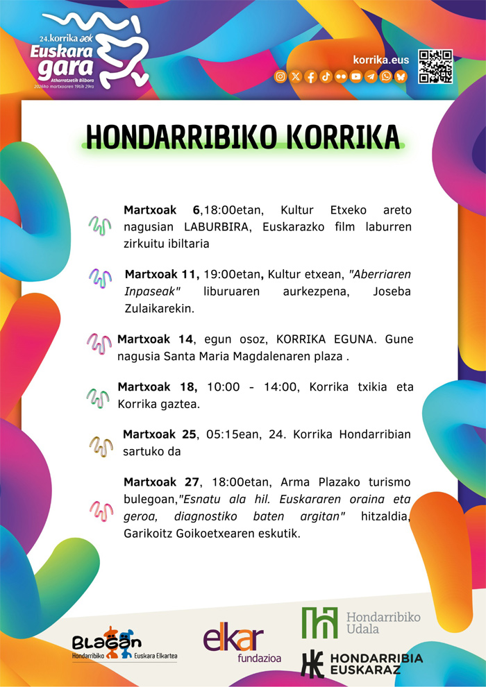 Martxoaren 25ean, asteazkenenean, goizaldeko 5:17tan sartuko da Korrika Hondarribira. Baina aurreko egunetan herria girotzeko asmoarekin hainbat ekintza antolatzen ari da Korrika batzordea: Martxoaren 14an Hondarribiko KORRIKA eguna antolatzen ari gara eta zure laguntza behar dugu! Baina baita laguntzaile edota lagun kanpainan ere. Zure aletxoa jartzeko prest bazaude, bete honako galdetegia: https://forms.gle/TqbH6N1WdTzTRGSa8